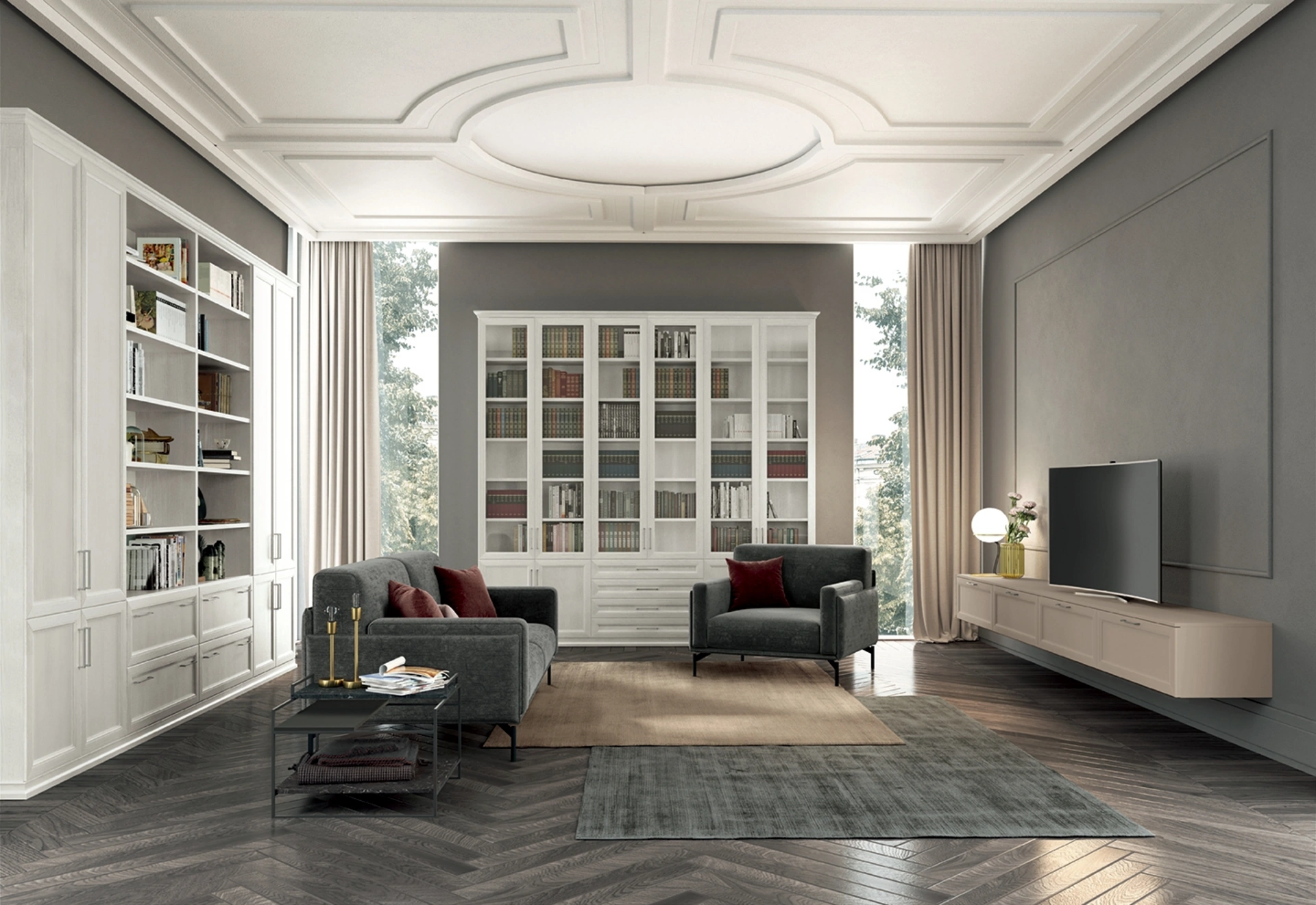 Il soggiorno è, in assoluto, la zona della casa dove ci si riposa ogni giorno, conversando con familiari e amici, riposando in solitudine nonché guardando la televisione. Le Librerie a muro Colombini Casa sono disponibili in differenti conformazioni: ad angolo, lineari, sospese e realizzabili su misura per te con vari componenti, mensole e vani. La Libreria Arcadia AS006 di Colombini Casa nell'immagine, nella variante in melaminico, è davvero funzionale e versatile, solida e durevole, nonché caratterizzabile seguendo le più personali problematiche abitative. Le Librerie classiche sono sempre tanto gradite per organizzare il living e le pareti, coniugando alla perfezione doti di funzionalità e stile.